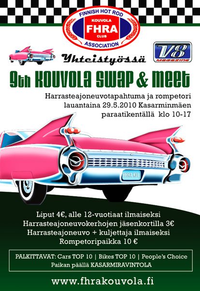 Vasemmalla jokavuotinen harrasteautoilijoiden meet & cruising Kouvolan raviradalla, oikealla logoluonnoksia rommin maahantuontifirmalle.