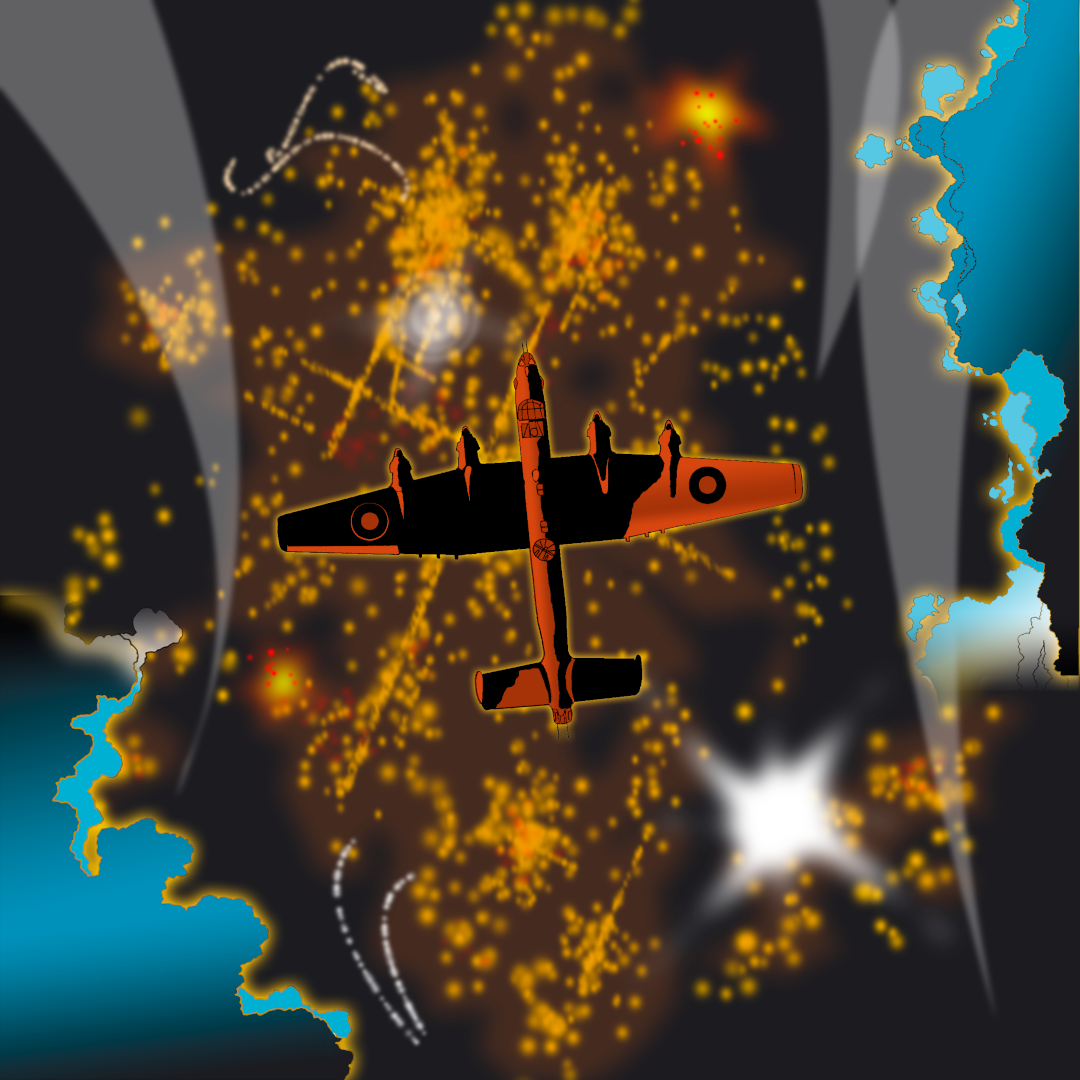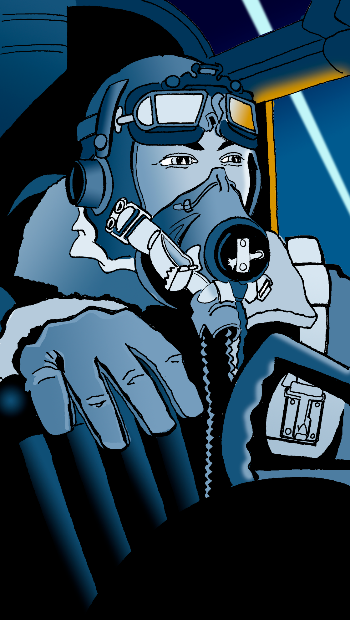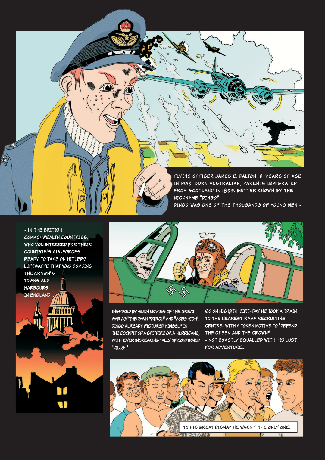 Toisaalta ilmailuun kajahtaminen takaa sen, että mahdolliset kuva-aiheet ja tyylit ovat varsin monipuolisia, väheksymättä aiheen vakavaa luonnetta. Ylhäältä myötäpäivään: Saksalaisen suurkaupungin pommitus, Halifax-koneen lentäjä, selkeän viivan tyylillä tehty vanhempi kokeilu ja Halifaxin pommitähtääjä laitteidensa parissa. . Kaikki esimerkit on piirretty tussilla, skannattu ja väritetty Photoshopissa.